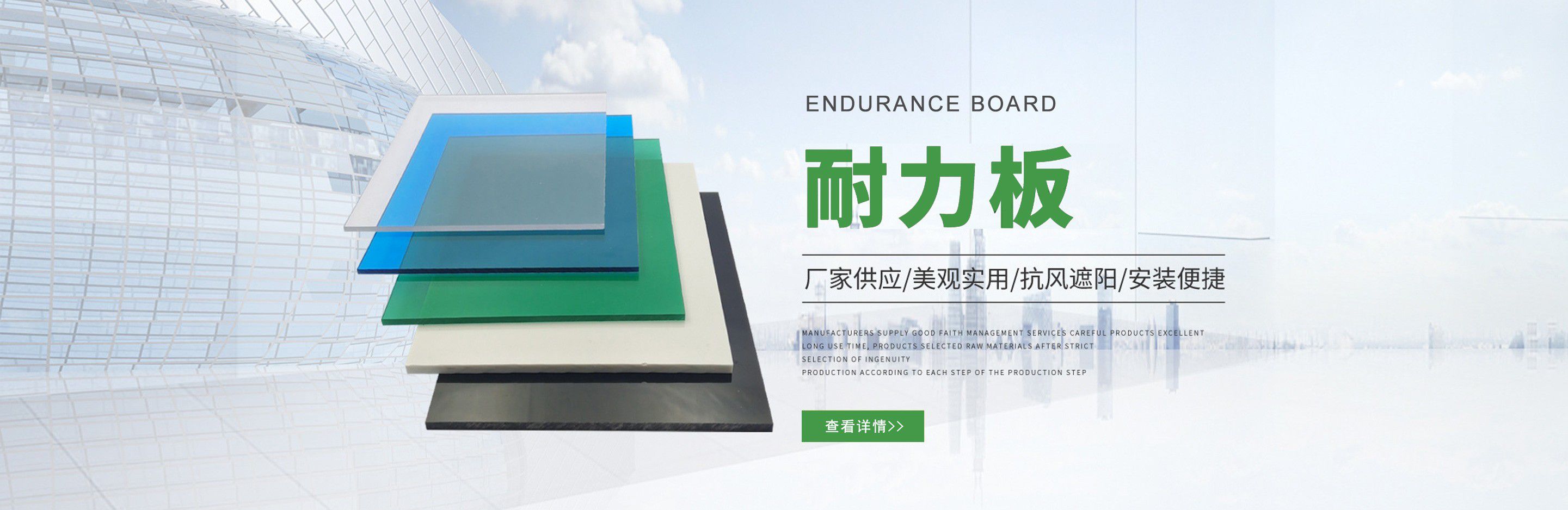聊城市沐金塑膠有限公司注冊資金2180萬元,占地20000余平方,擁有自建廠房15000平方,員工100余名。10余年來,公司主營耐力板,鎖扣耐力板,耐力板深加工,無動力通風器,組合雨搭,PVC硬脂板,耐力板廠家等板材的發展戰略,逐漸成長為綜合性企業?! 」緭碛卸鄺l板材共擠生產線,采用世界知名品牌進口原材料和先進工藝,依據完善的ISO9001質量管理體系和ISO14001環境管理體系,為產品的卓越品質提供了強有力的保證。憑借過硬的創新能力和堅實的硬件基礎,贏創已成為國內領先的熱塑性板材生產商,產品被廣泛應用于建筑業、農業、工業、廣告業、安防行業及DIY領域?! 」臼冀K致力于通過提供最優的板材應用解決方案,為客戶創造最高的價值;堅守創新、質量、靈活、服務和速度的核心價值觀;堅持“完美的產品需要完美服務的支持”的經營理念,努力實現成為世界領先的板材與解決方案供應商的夢想?! ≡谖磥?,公司將立足客戶需求,不斷改變和完善現有產品,拓展產品線和充分開發板材的應用領域,為客戶創造全方位的價值。同時更好地實現員工的價值,實現公司團隊的價值。我們將與您一起創贏未來! 企業使命:成為世界領先的板材與解決方案供應商。 公司愿景:通過提供最優的板材應用解決方案,為客戶創造最高的價值?! 『诵膬r值觀:質量...
